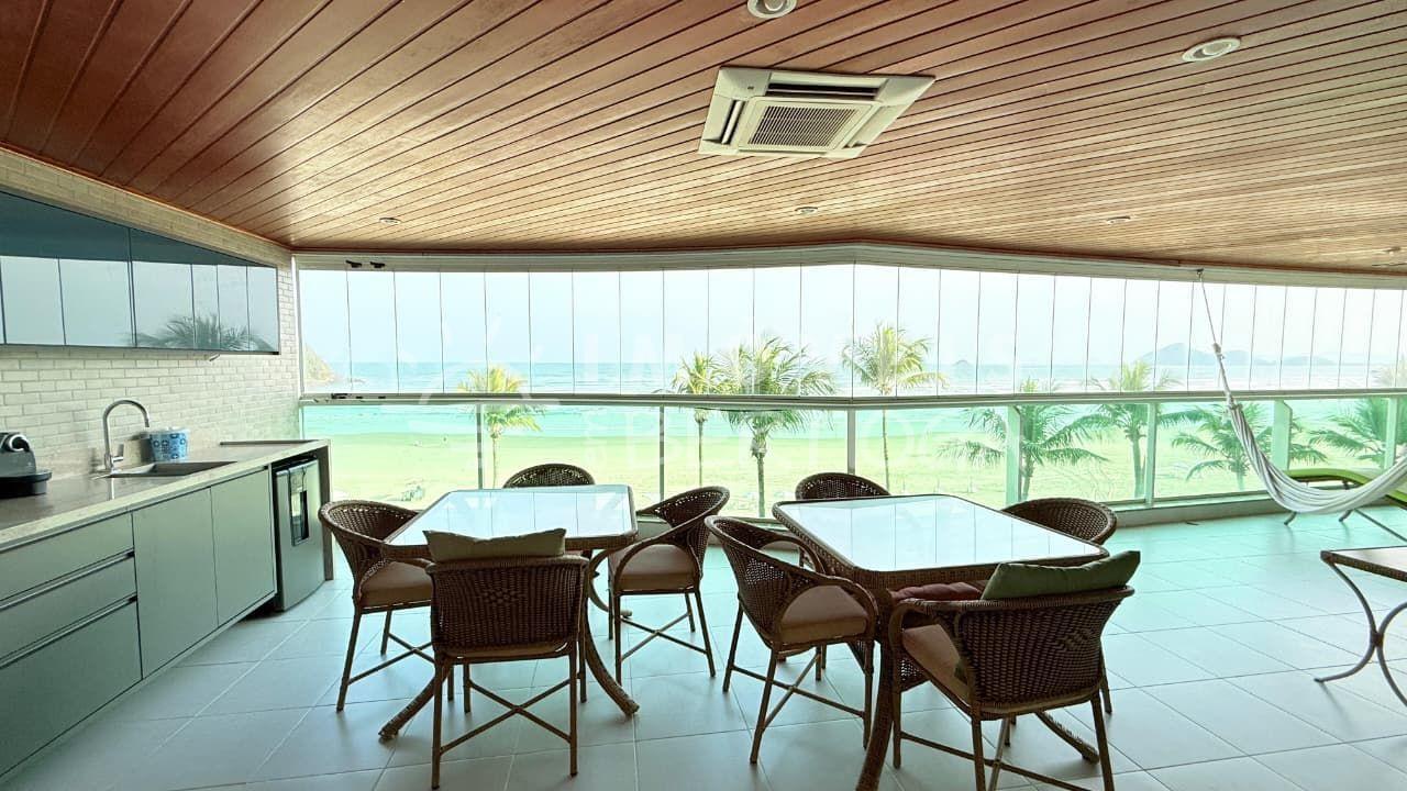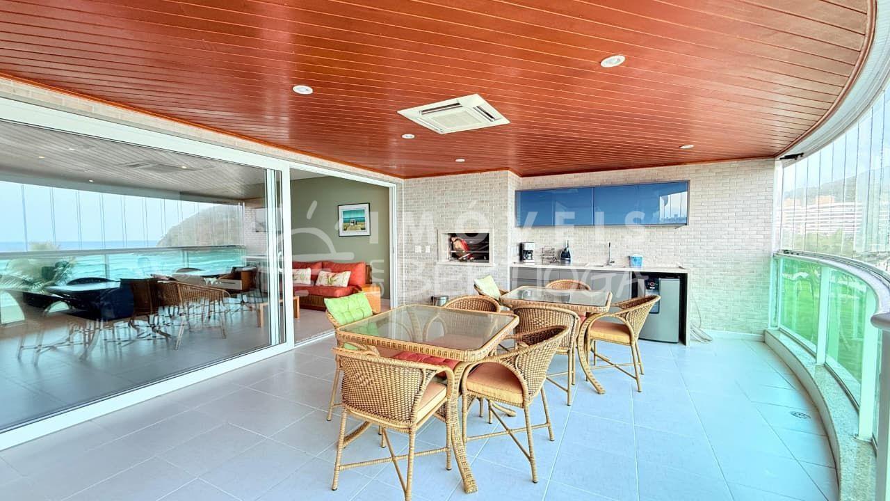 Sala integrada com varanda gourmet ampla e vista panorâmica para o mar, ideal para confraternizações.