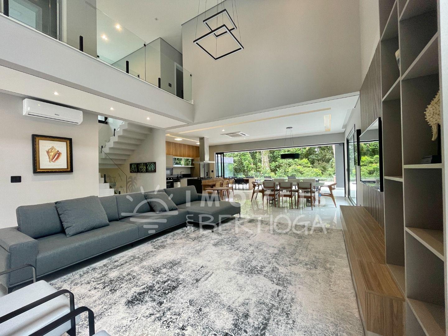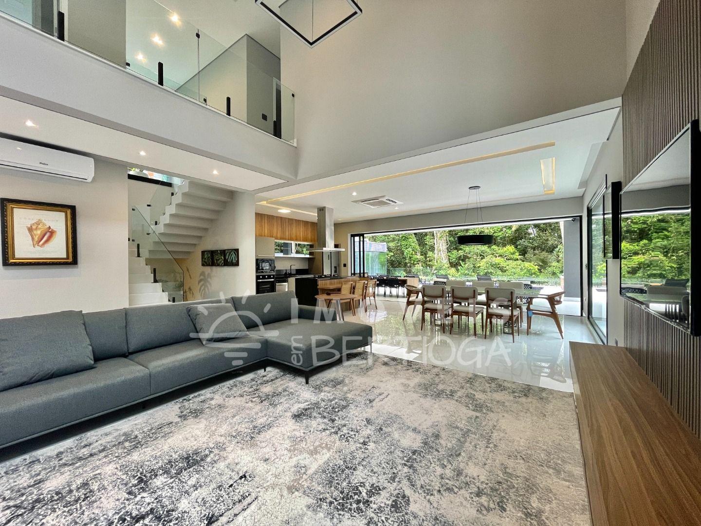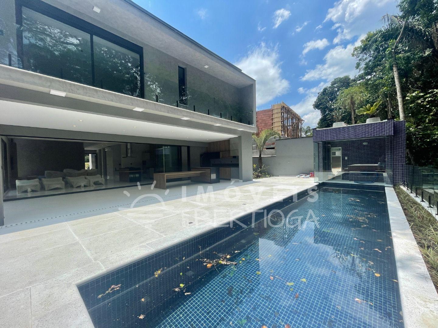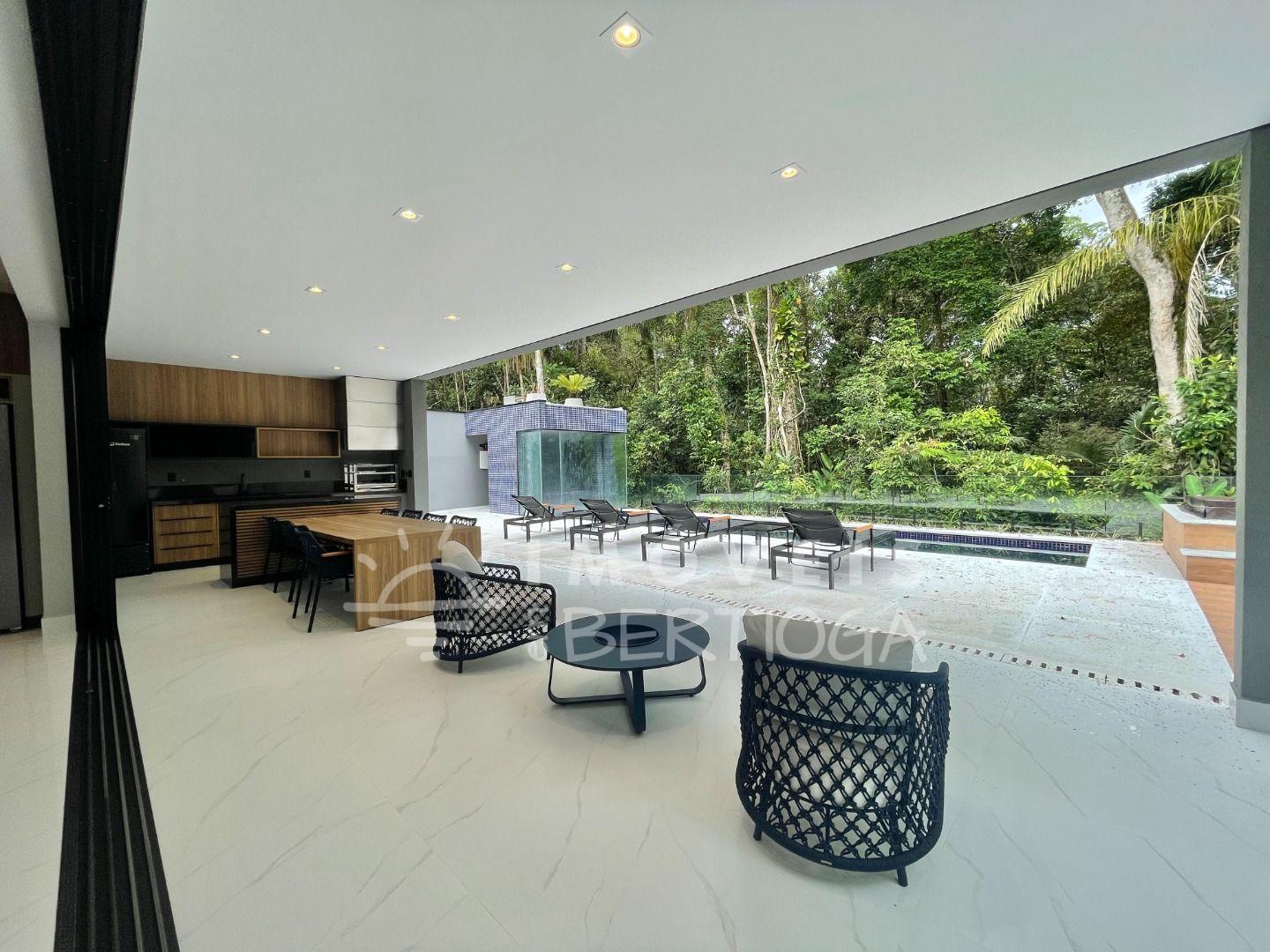 Com 553m² de terreno, conta com 6 suítes, piscina com borda infinita, raia, prainha, hidromassagem aquecida e sauna. A sala tem pé-direito duplo e há um lounge panorâmico com vista para a Mata Atlântica.