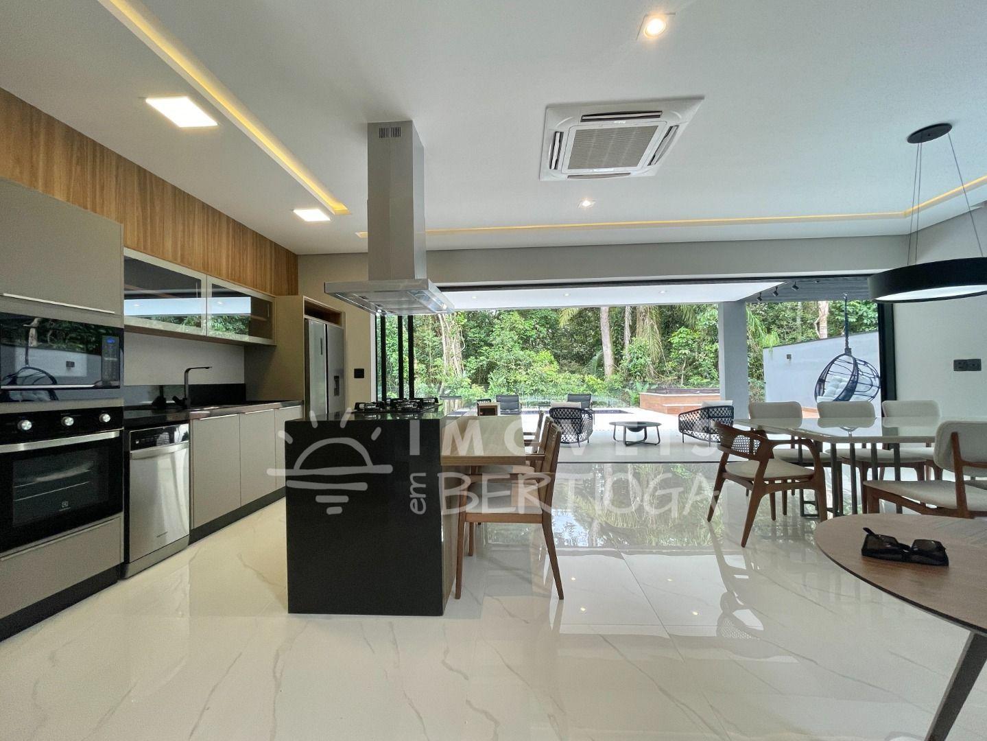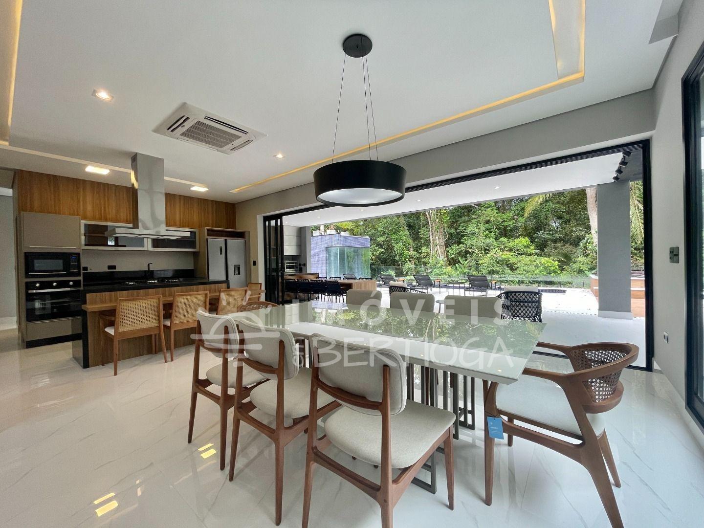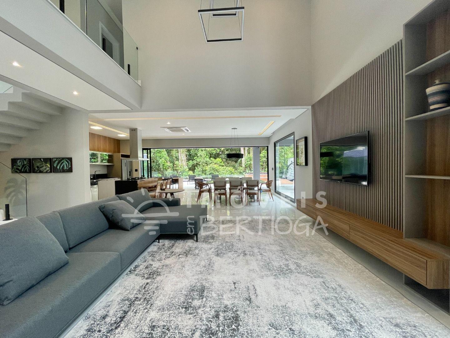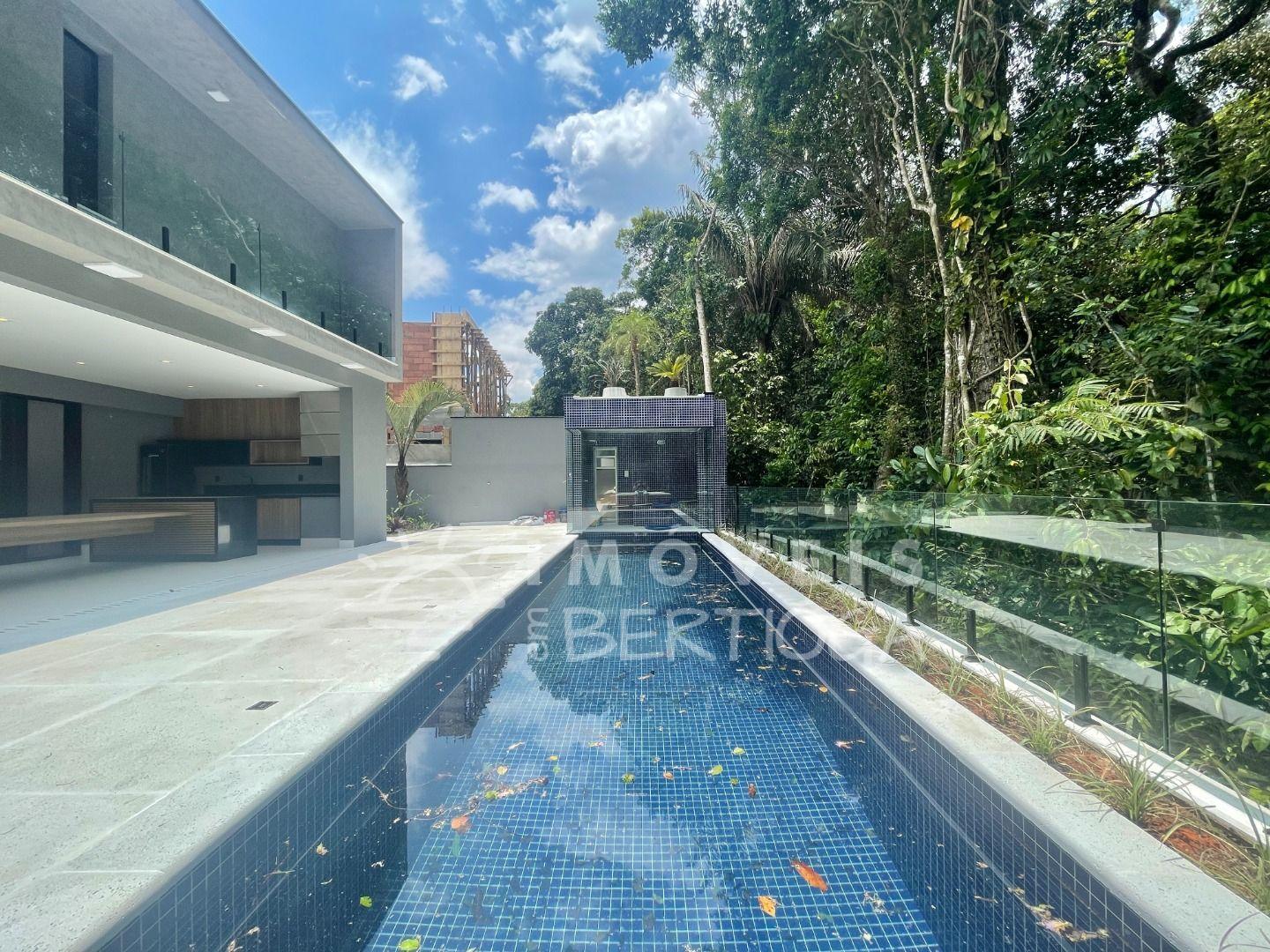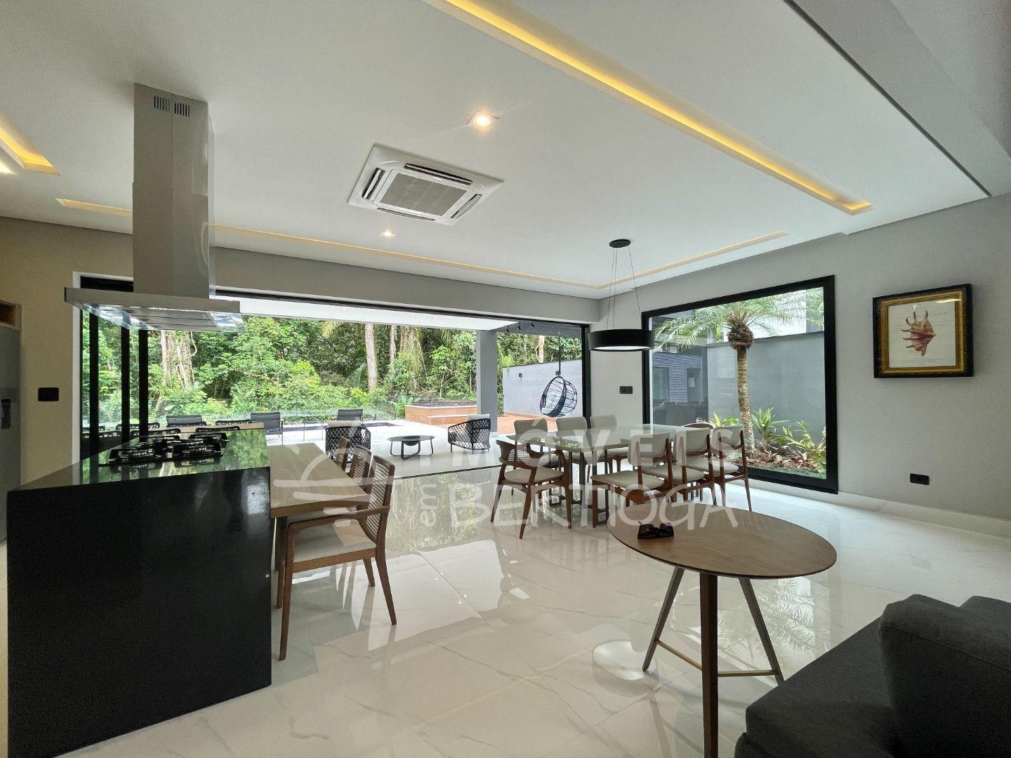 Com 553m² de terreno, conta com 6 suítes, piscina com borda infinita, raia, prainha, hidromassagem aquecida e sauna. A sala tem pé-direito duplo e há um lounge panorâmico com vista para a Mata Atlântica.