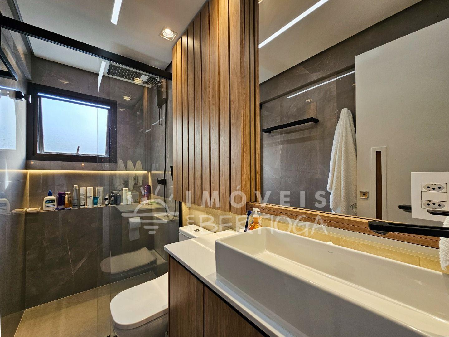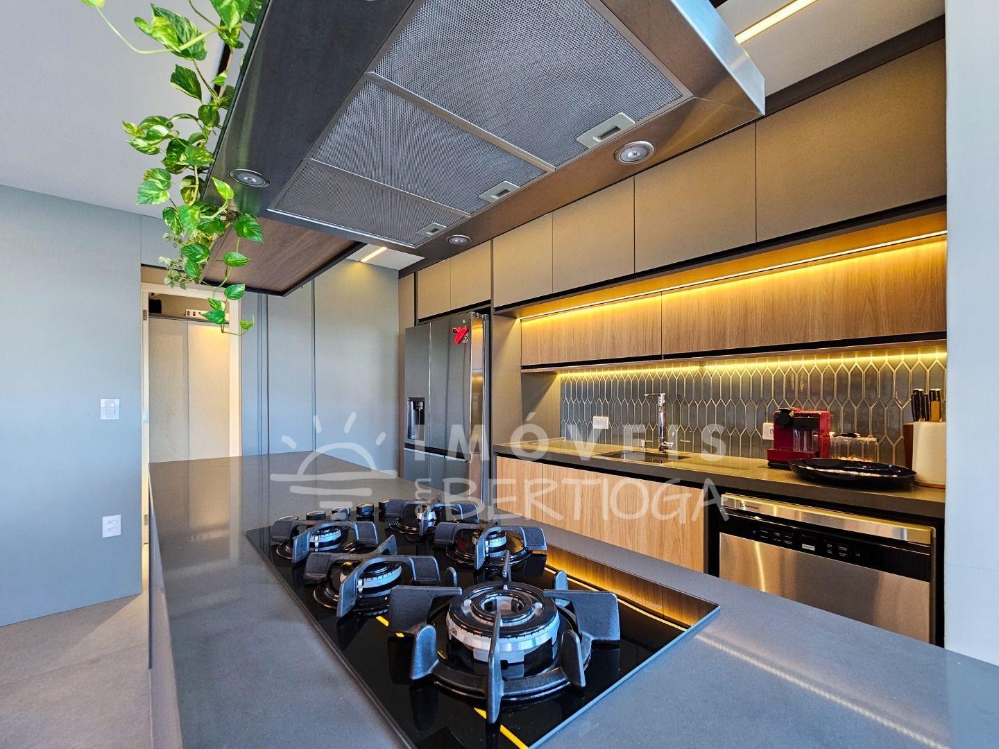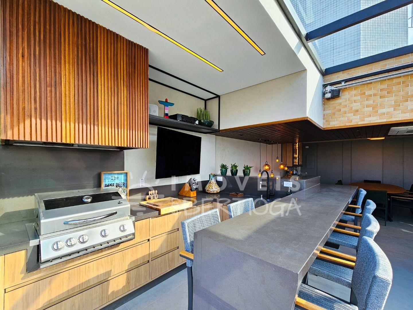 São 311 m² de área útil, 5 dormitórios (sendo 3 suítes), varanda gourmet, ar-condicionado e 3 vagas de garagem.